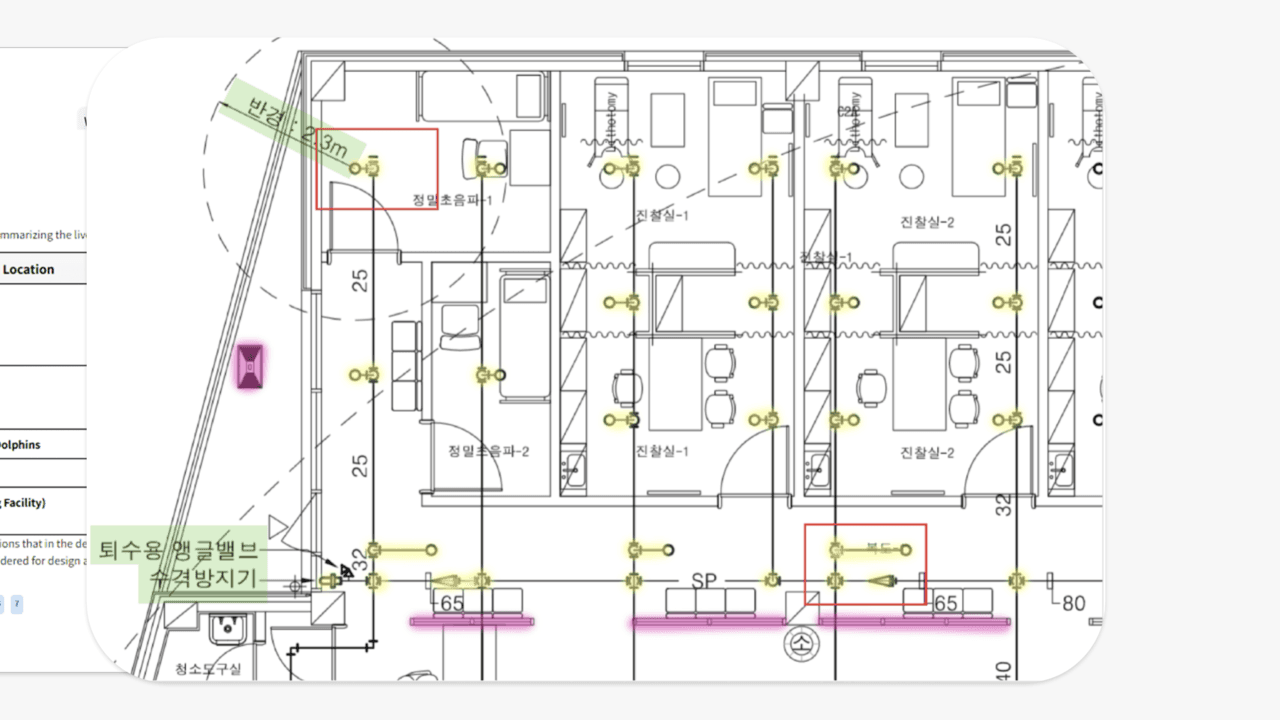 도면 내 소방·안전 기호를 자동 탐지하여 규정 준수 검토를 지원합니다.