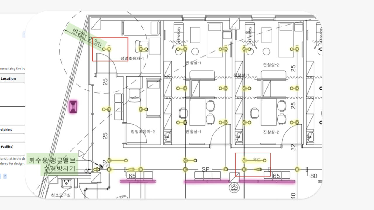 도면 내 소방·안전 기호를 자동 탐지하여 규정 준수 검토를 지원합니다.